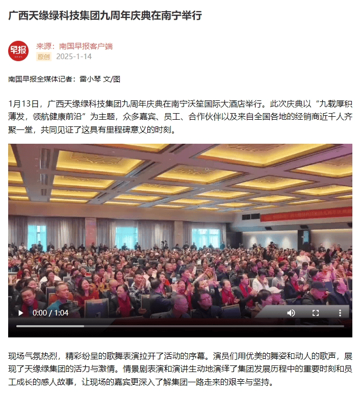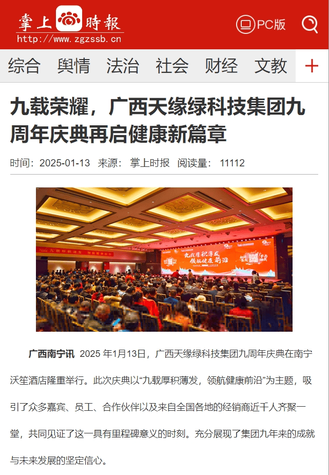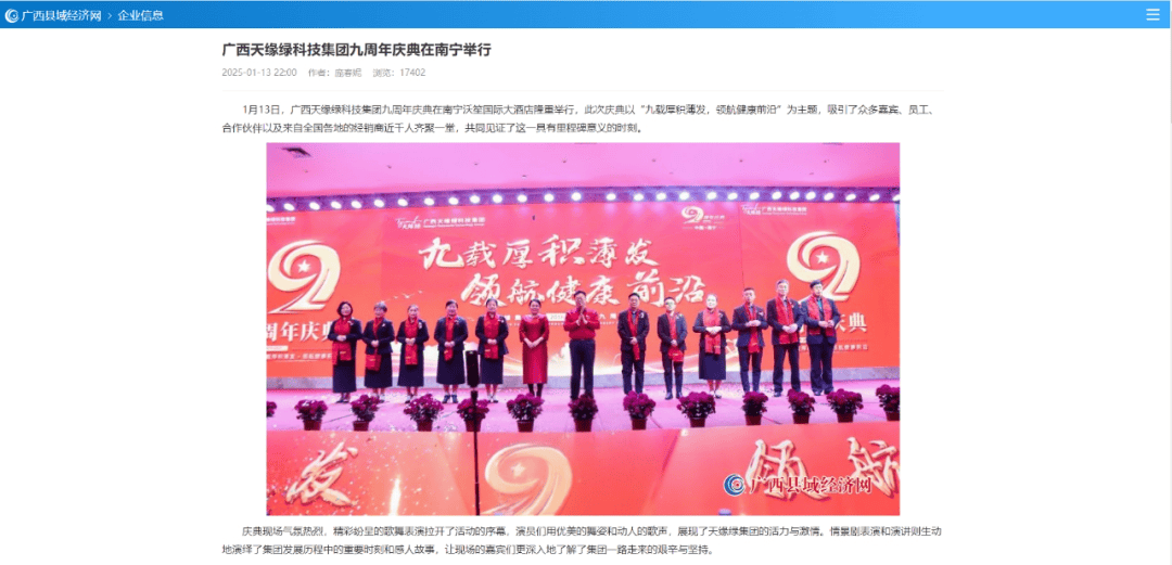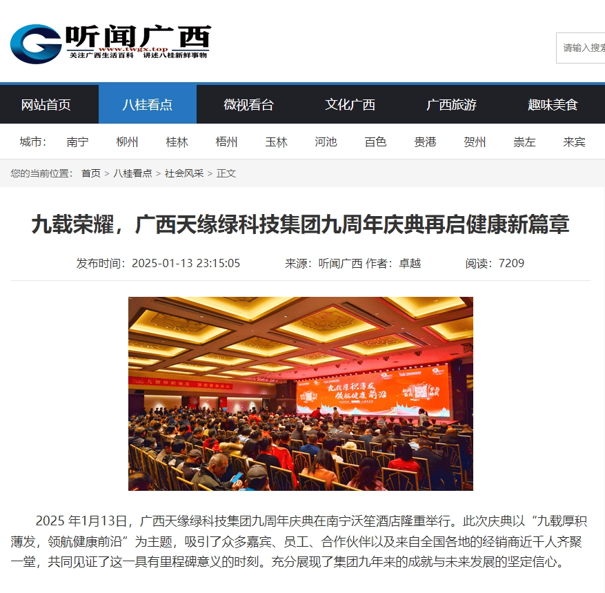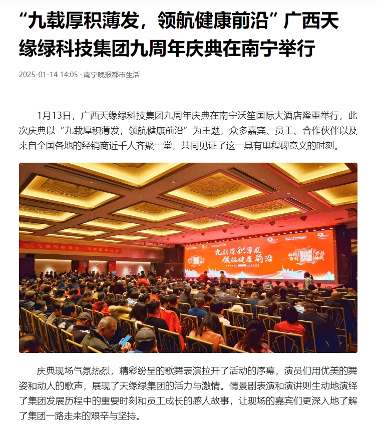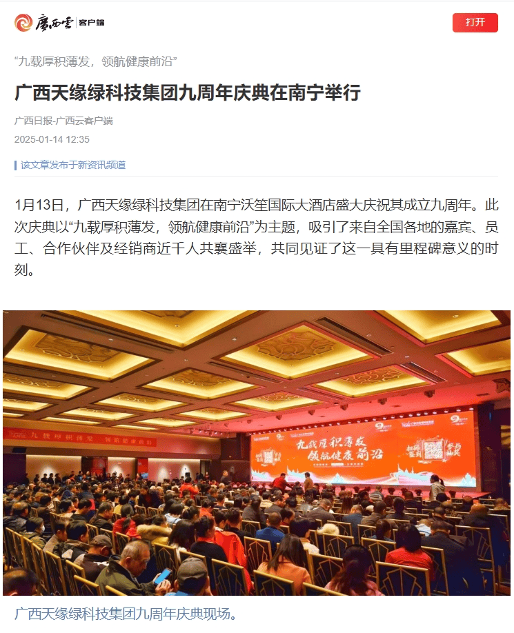 慶典盛況空前,南國早報、聽聞廣西、東盟新聞周刊、中國報道、東盟頭條、掌上時報、廣西縣域經(jīng)濟(jì)網(wǎng)等三十多家新聞媒體紛紛聚焦此次慶典,競相報道這一健康產(chǎn)業(yè)的盛事。媒體記者們用鏡頭捕捉每一個精彩瞬間,用筆觸記錄每一份感動與榮耀,將天緣綠集團(tuán)九周年的輝煌與夢想傳遞給千家萬戶。
